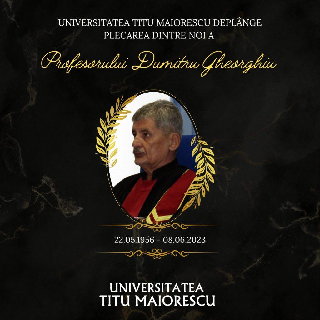 Plecarea dintre noi a Profesorul Dumitru Gheorghiu reprezintă o grea pierdere pentru Universitatea Titu Maiorescu și pentru învățământul universitar românesc. Domnia sa rămâne în galeria marilor profesori ai Universității, care au pregătit, prin educație de calitate, promoții de studenți și au participat la edificarea unui lăcaș de învățătură academică de elită al țării. Comunitatea academică maioresciană își exprimă recunoștința pentru întreaga activitate și contribuție a Profesorul Dumitru Gheorghiu la dezvoltarea Universității.
